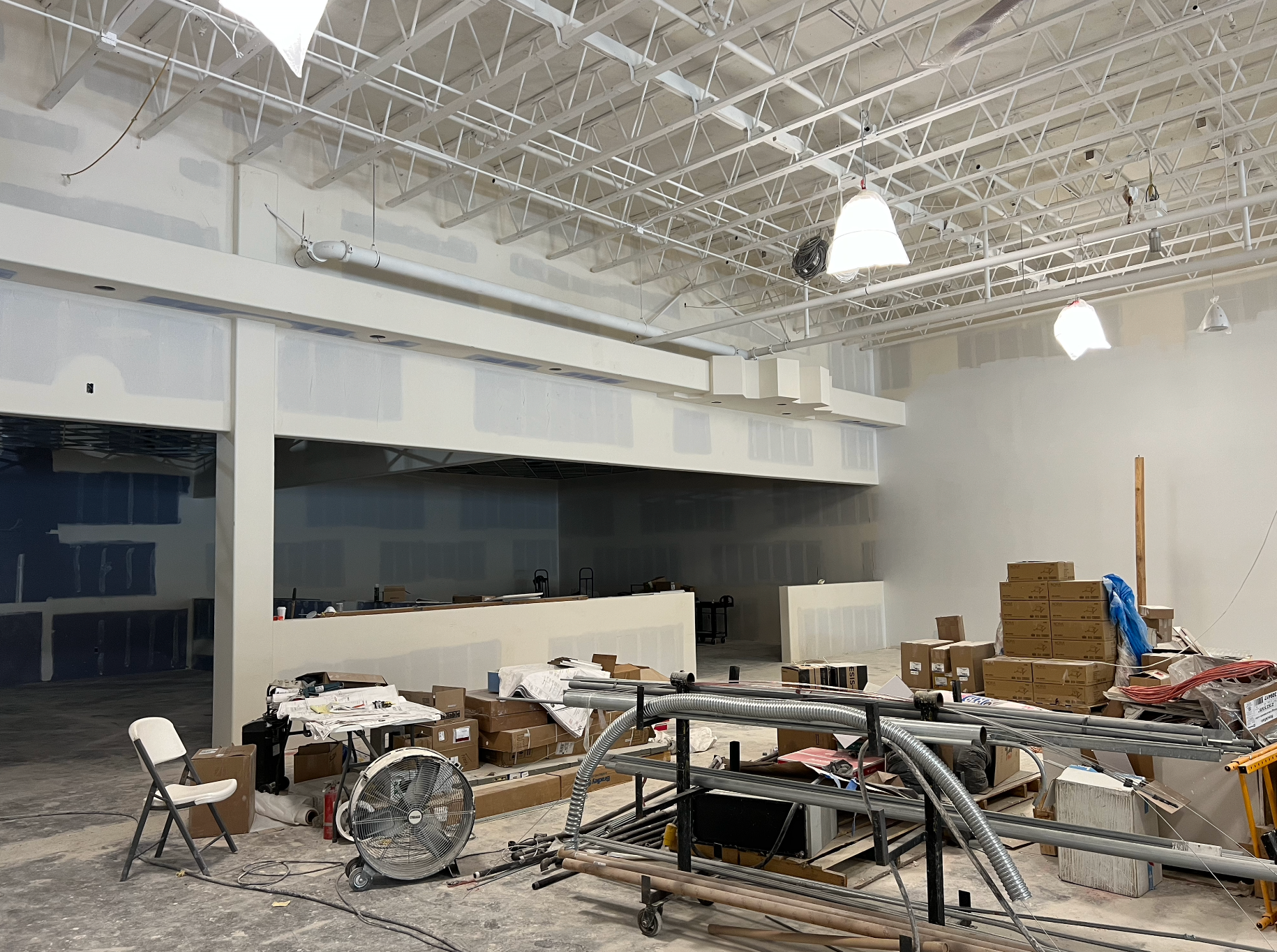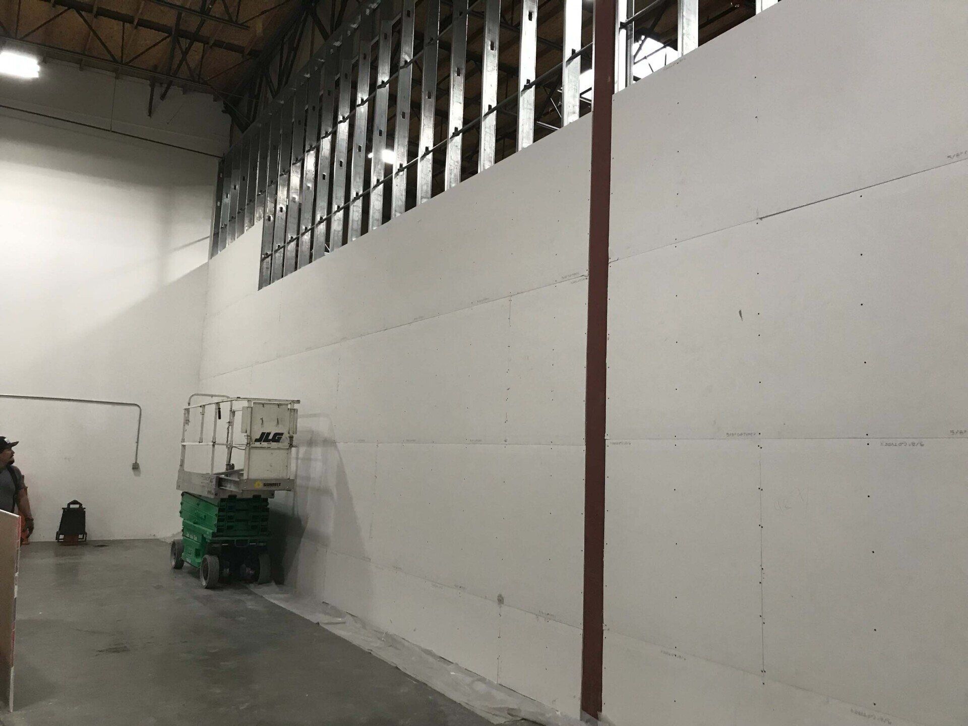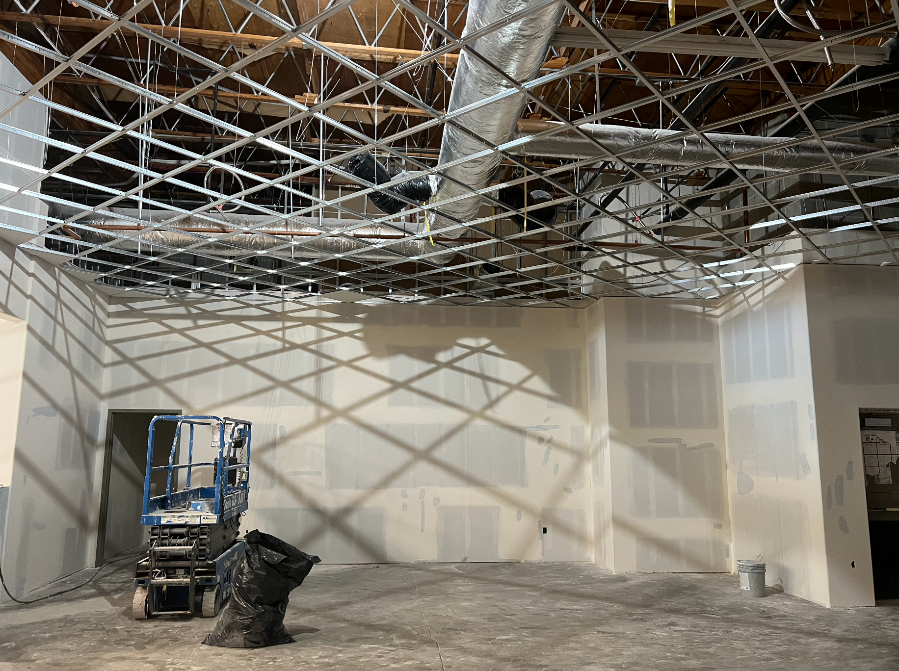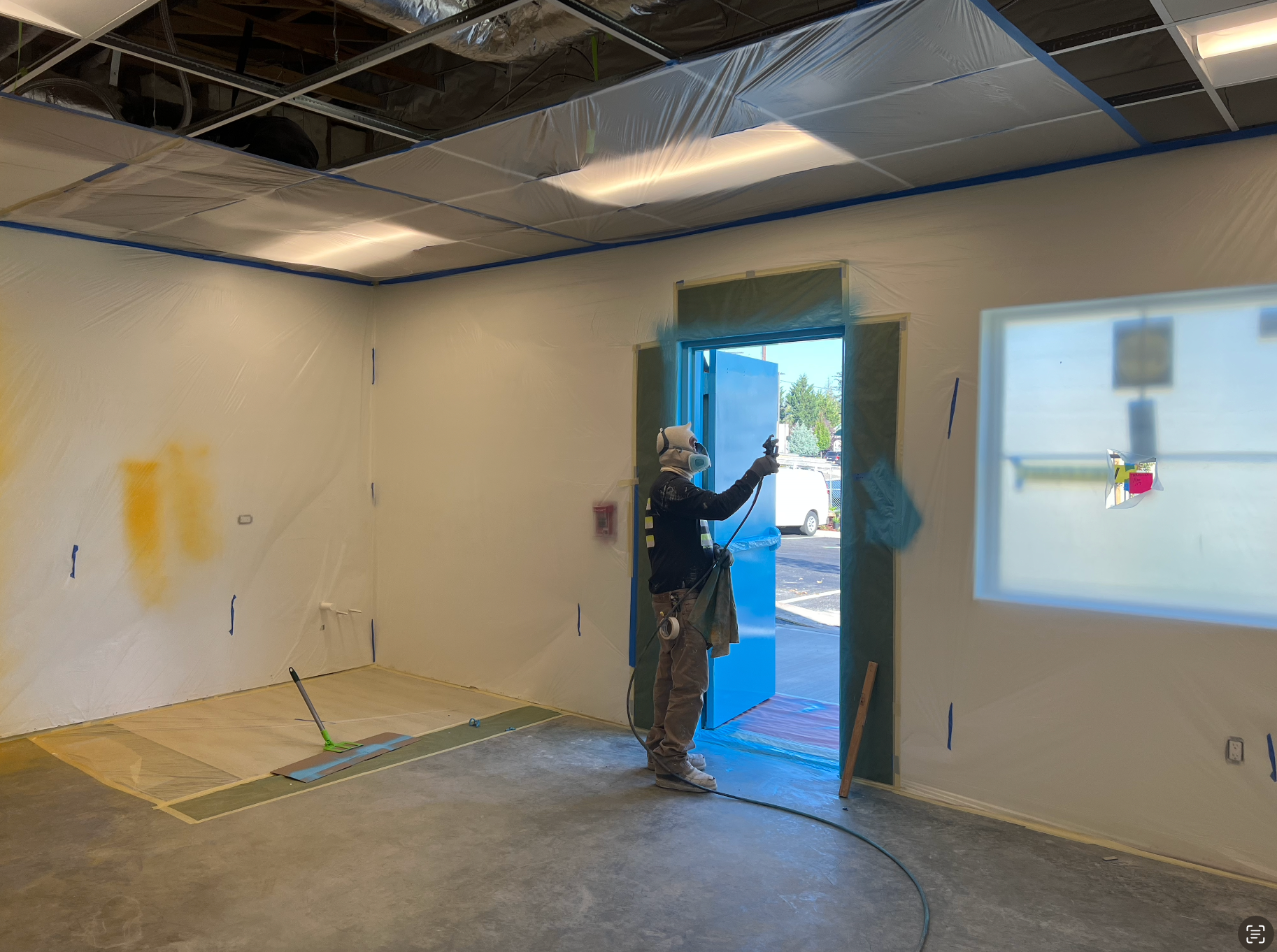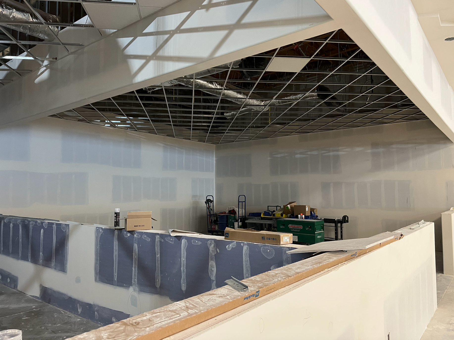 Drywall installed and finished, acoustic ceilings and paint