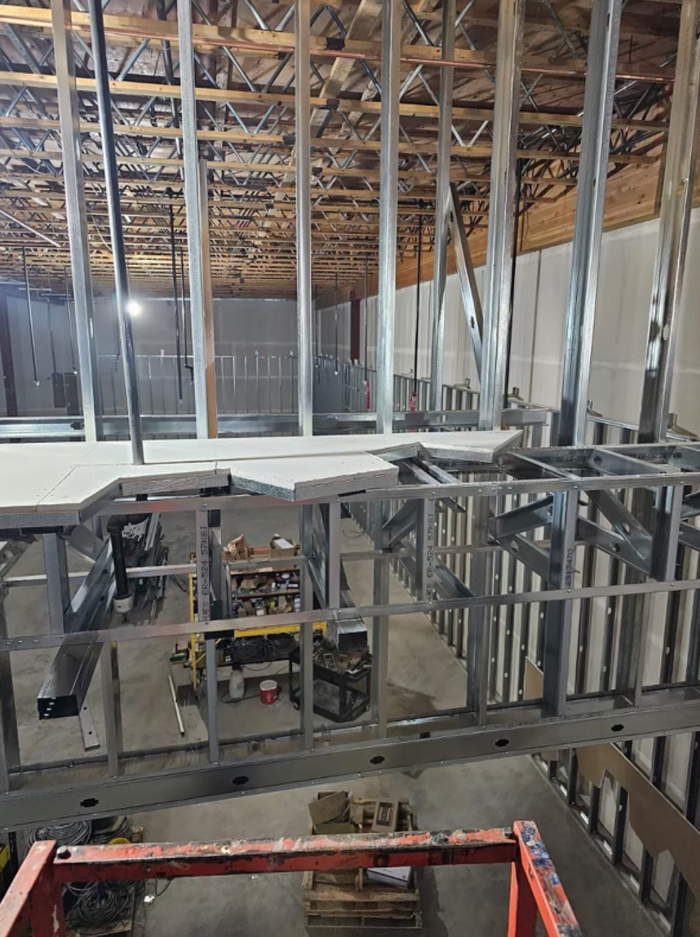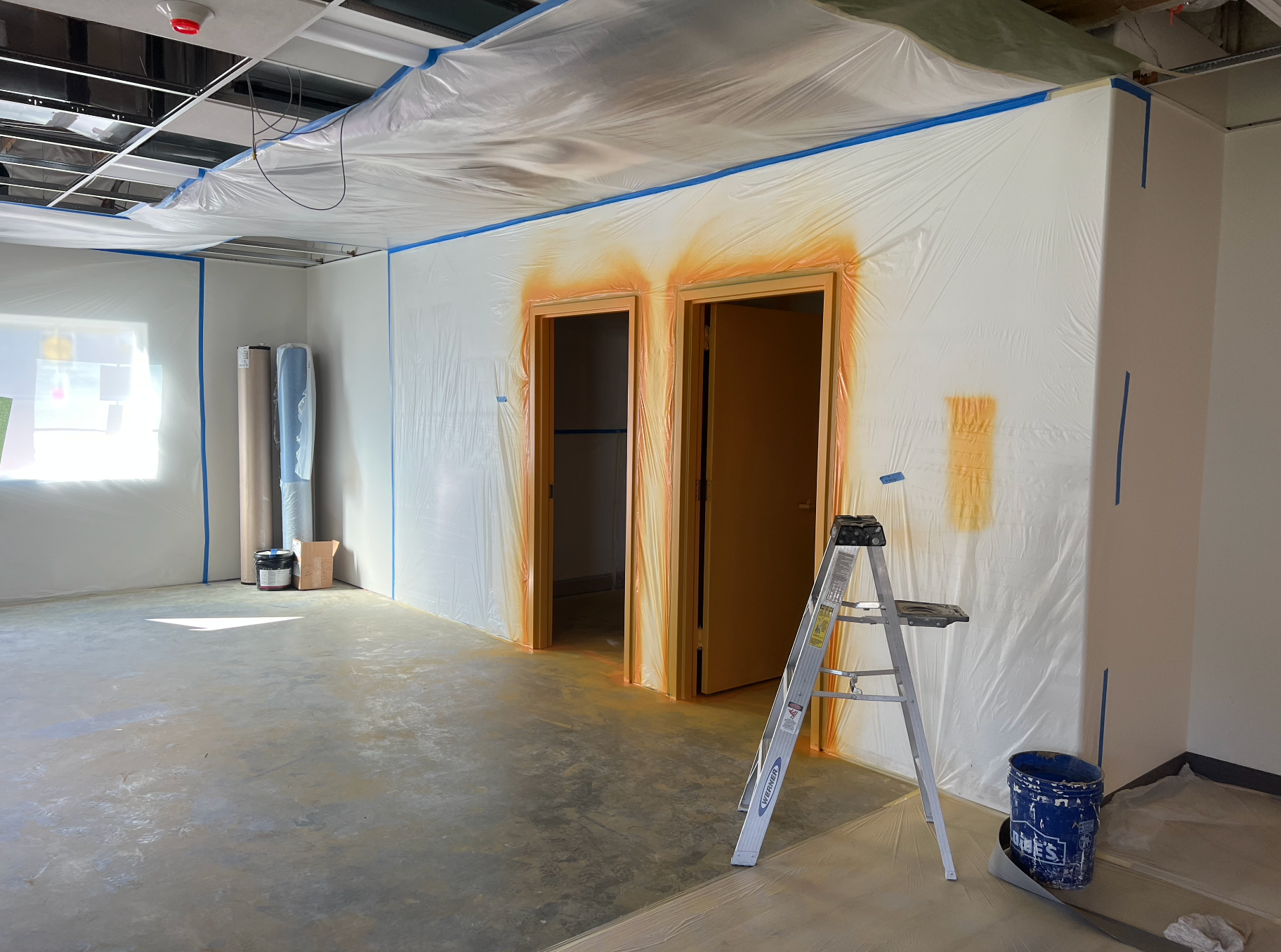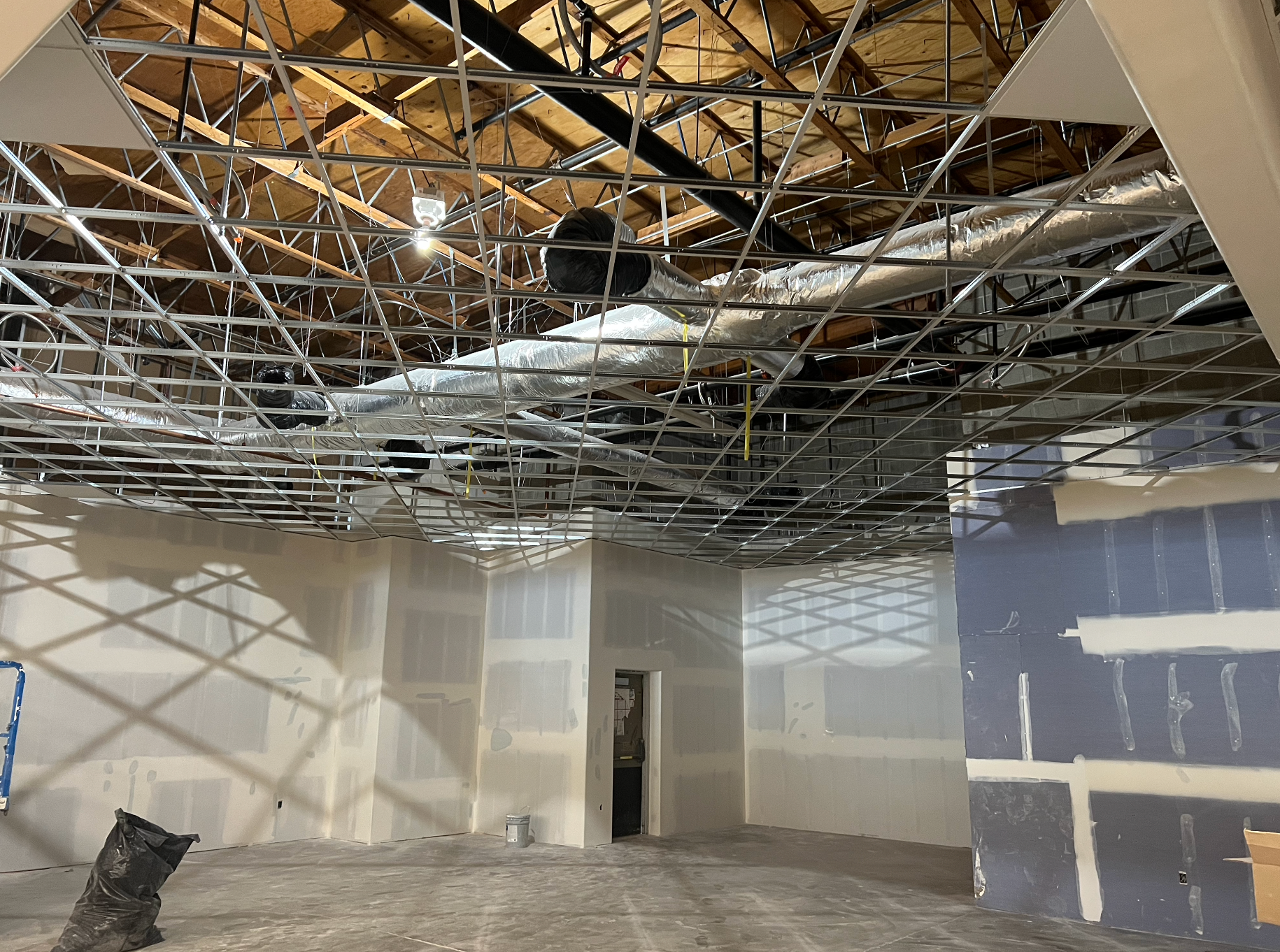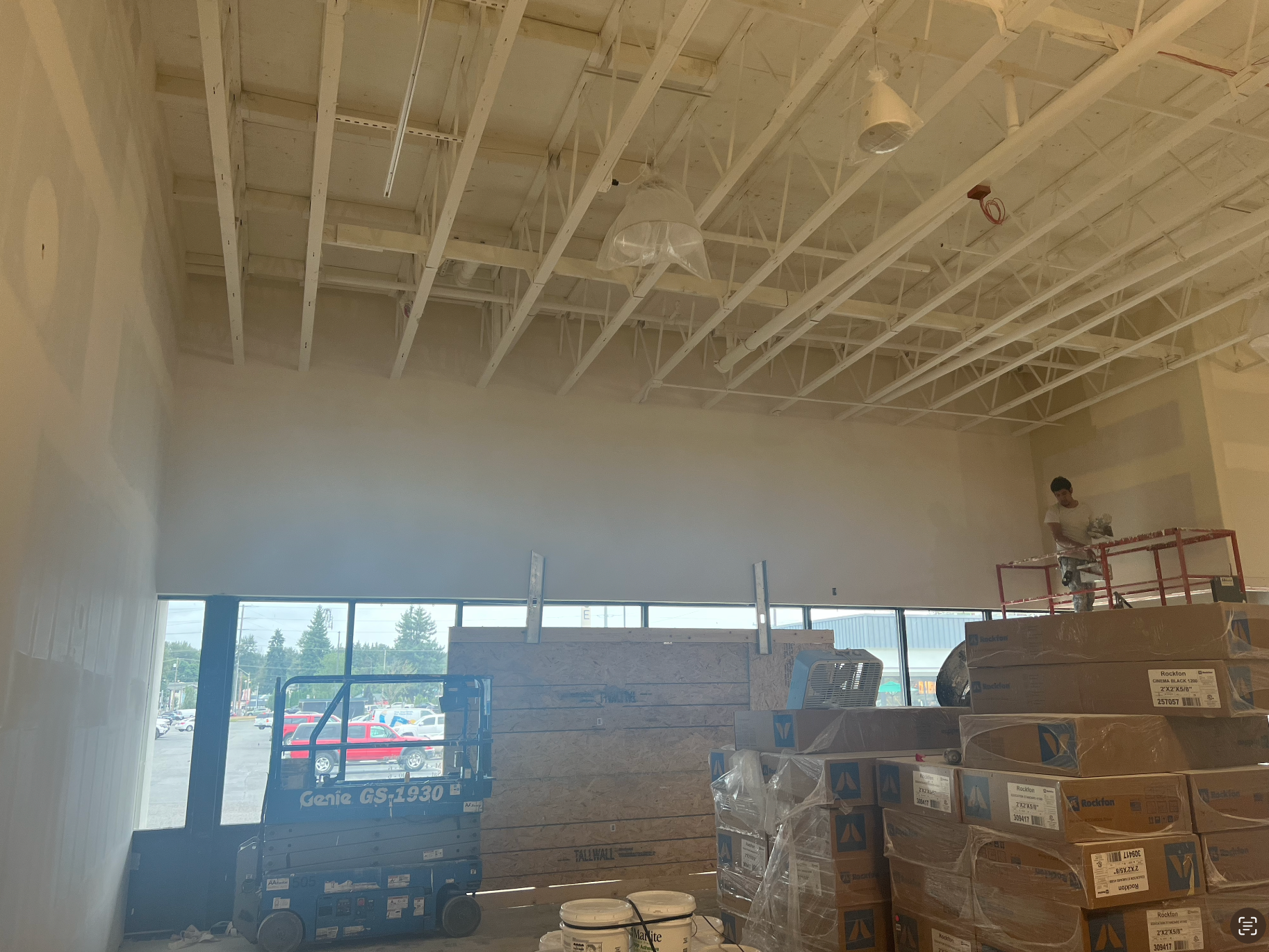 Drywall installed and finished, acoustic ceilings and paint